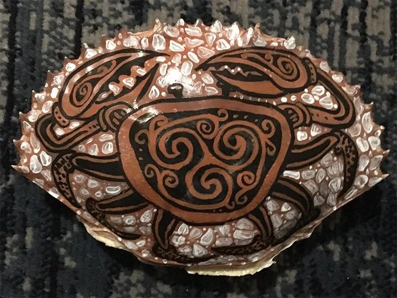 I paint, crochet and sculpt. I paint portraits, stylized landscapes, social issues, stones, eggs, cuttlefish, crab shells. I crochet hats, children’s jackets, bags, flip flops, beanies, hanging sculptured fish and plant holders. I sculpt stone plant/candle holders; and recycle the decking rope from Coochiemudlo ferry into lampshades, lamp bases, angels etc.